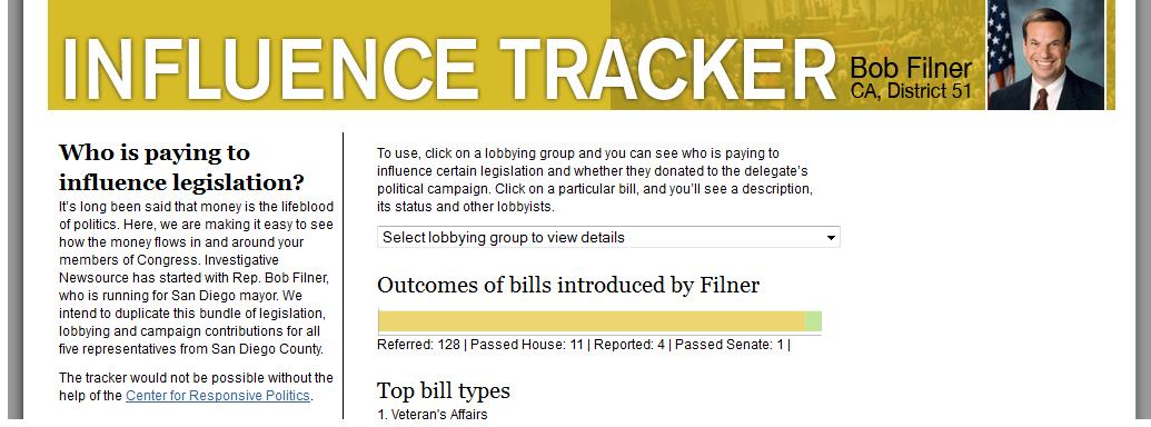 - Interviewed six of the companies and groups that were among Filner’s top contributors and benefited from his legislation, earmarks or endorsements. We also interviewed two experts in campaign finance and lobbying.